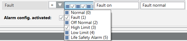 d. Open the selection pane and activate the corresponding BitStrings. The activated BitStrings act as an AND condition. All activated BitStrings must be TRUE to trigger an alarm. In the following example, these are Fault (1) and High Limit (2).