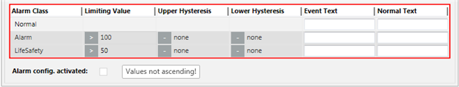 You can easily create an advanced temperature monitor by selecting the temperature sensor (Present_Value) in System Browser. Define a corresponding message for each temperature limit. The corresponding message is sent out when the set values are reached. Use the Hysteresis columns to avoid triggering additional messages for slight temperature deviations.