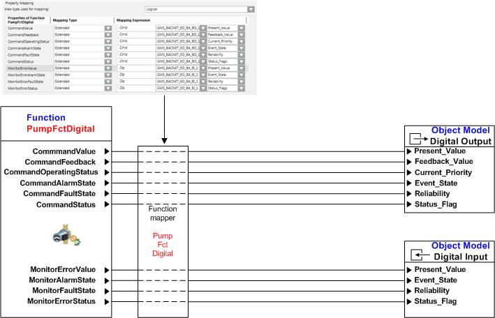 - In the Function Mapper of the PumpFctDigital Function, assign the properties of the CommandDigital and MonitorError Functions.