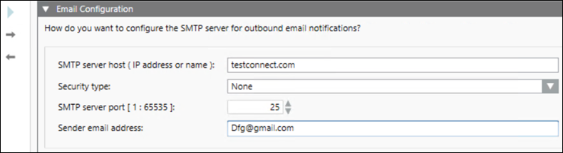 If you select Create new SMTP email server and click Next page . The wizard displays Step 2. Go to Configure the Email Setting step.