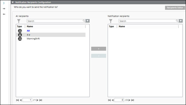 Select the recipients to whom you want to send the notification, and click to move the selected recipients to the Notification recipients section on the right. NOTE: You can configure new recipients using the Recipients Editor button. Refer to the Recipients topic for more information on adding recipients.